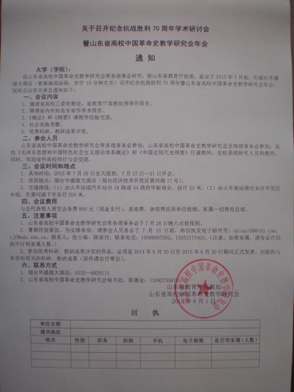 经山东省高校中国革命史教学研究会常务理事会研究,报山东省教育厅批准,兹定于2015年7月底,在烟台华盛源大酒店召开纪念抗战胜利70周年学术研讨会暨山东省高校中国革命史教学研究会年会。会议通知如下。
