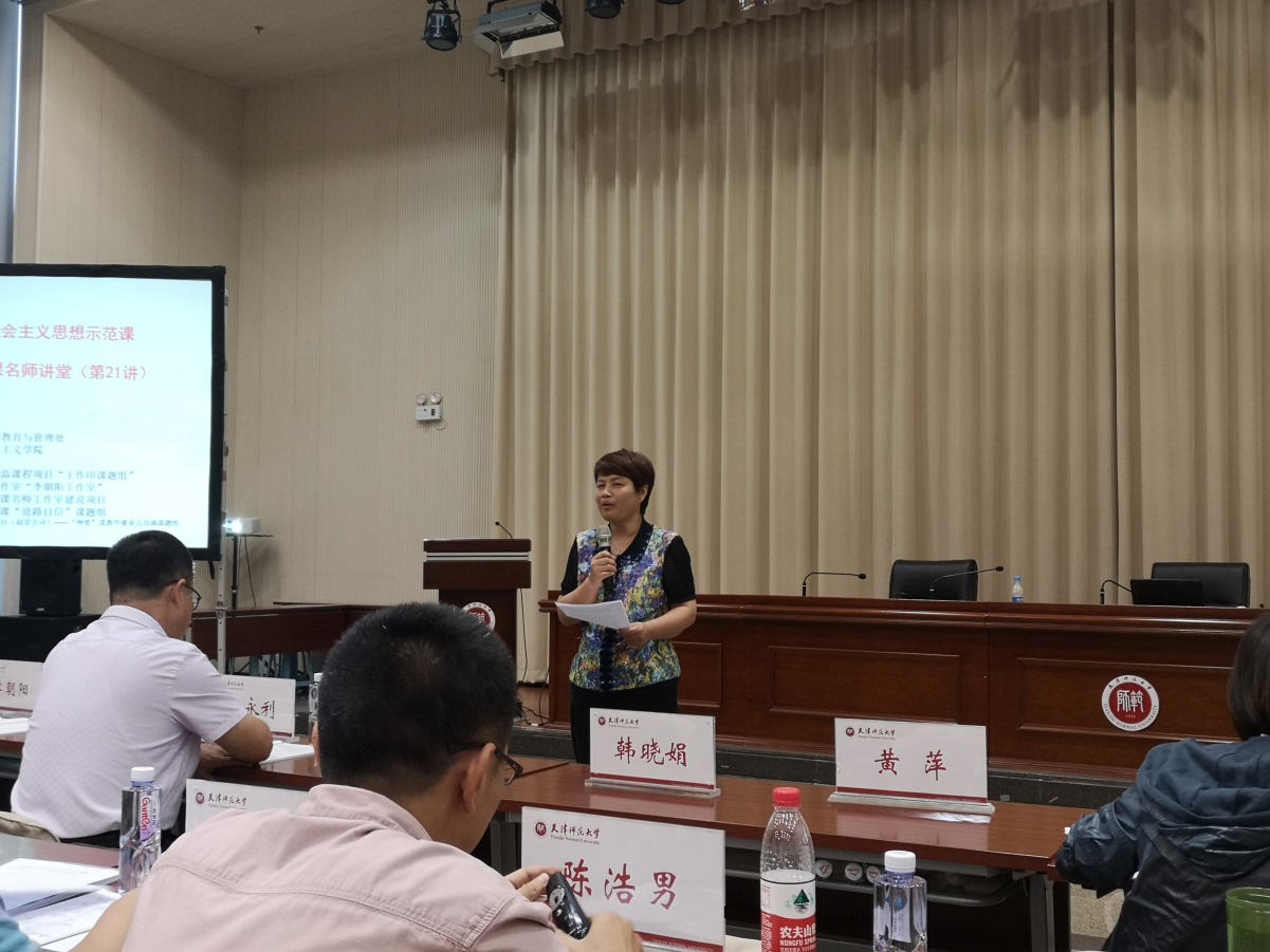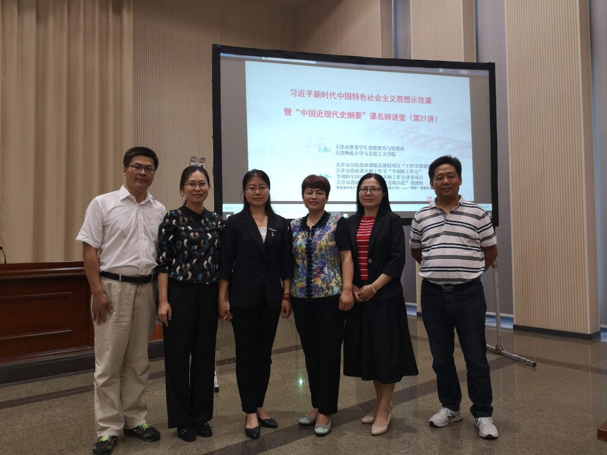 本次活动,应邀展示的均为在全国或天津市教学比赛中获奖的优秀教师。来自绵阳师范学院的韩晓娟主讲“戊戌变法失败的原因和历史启示”,天津外国语大学的郑海呐主讲“中国特色社会主义文化”,天津师范大学的于江涛主讲“科学评价历史伟人毛泽东”,天津职业大学的陈浩男主讲“培育和践行新时代文化自信”,天津城建大学的屈彩霞主讲“新民主主义革命道路与井冈山精神”,天津工业大学的杨永利主讲“供给侧结构性改革”。期间,绵阳师范学院韩晓娟、天津师范大学李朝阳两位专家分别做了《强化“三三三”教学体系,打造“六味”课堂,增强思政课实效性》、《“三入八讲”法在思政课教学中的运用》为主题的教学经验介绍。另外,海角视频 毛玉美教授参与了会议的主持人与点评工作。这些优秀教师的教学展示体现了新时代思政课的思想性、理论性和亲和力、针对性的有机统一,参会的老师们一致认为此行收获很大。会议结束后,海角视频 教师还参观了天津师范大学海角视频 。