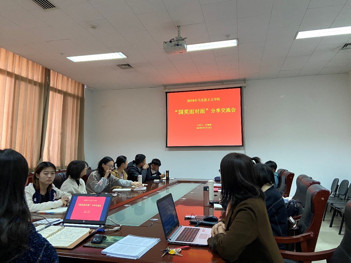 11月13日下午,海角视频 于606会议室举办了“国奖面对面”分享交流会。会议由徐莹副教授主持,国家奖学金获得者—2018级研究生李城城同学作了分享,2019级马克思主义理论专业的全体同学参加了这次交流会。