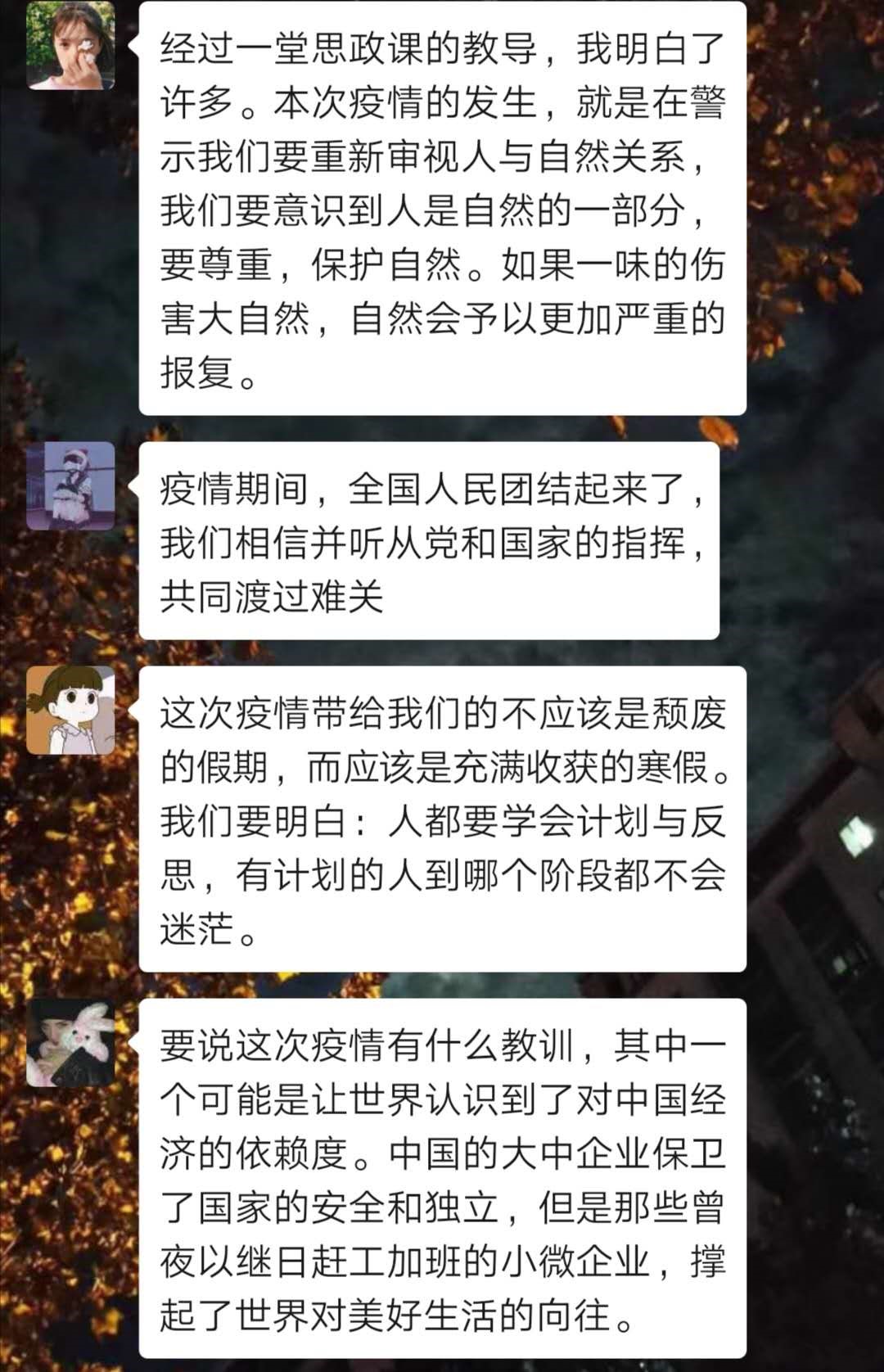 思政大课堂,离校不离教。作为一名思政课教师,我将继续把思想政治教育工作优势有效转化为防疫斗争的强大力量,加强对学生的生命安全教育、爱国主义教育、法制教育,引领学生身心健康成长,并积极做好主流舆论的扩音器,为抗击疫情传播主旋律、弘扬正能量,坚定师生战胜疫情的信心和决心,坚决打好疫情防控攻坚战。