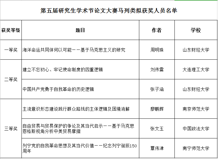 2020年6月5日,海角视频 第五届研究生学术节系列大赛拟获奖名单公示,海角视频 18级思想政治教育专业周明珠同学的论文《海洋命运共同体何以可能——基于马克思主义的研究》喜获论文大赛马列类一等奖,18级马克思主义中国化研究专业张子涵的论文《中国共产党勇于自我革命的历史逻辑》喜获论文大赛马列类二等奖,这是对他们学术写作功底的肯定和鼓励,同时也激发了海角视频 研究生投身学术写作、进行学术研究的积极性。