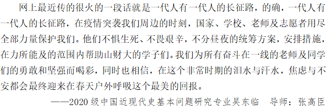 疫情来势汹汹,每个人都应该躬身入局,为疫情阻击战奉献自我的力量。为展现新时代学生的青春风采和同心战“疫”的决心,学院组织同学拍摄“我们的春天”——山财大师生同心战“疫”视频,为抗击疫情加油。