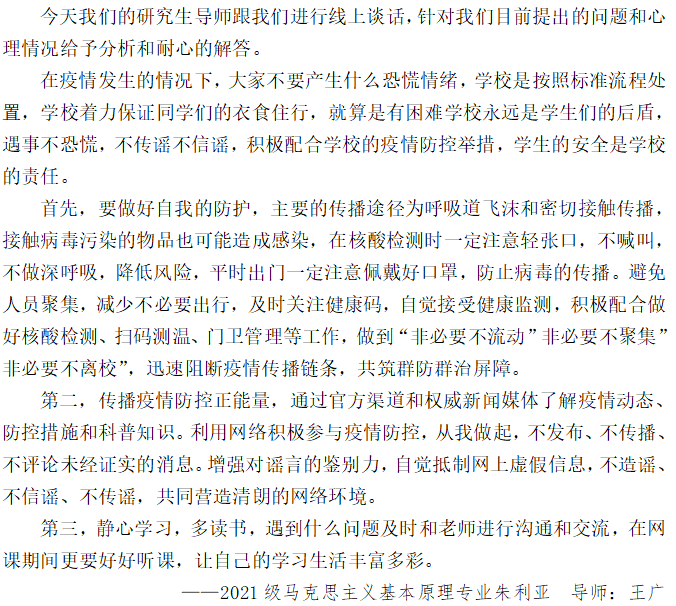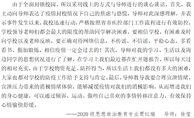 同时为精准掌握校园封闭管理期间学生的思想动态和实际需求,做好对学生的关心关爱工作,自4月1日起,学院启动重点学生谈心谈话工作,学院党委副书记、辅导员、导师悉数参与其中,谈心谈话25名学生。