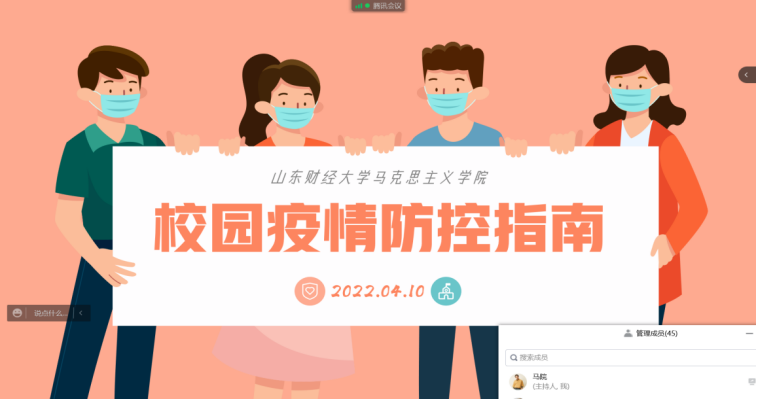 为贯彻落实学校关于疫情防控工作的部署和要求,进一步做好新冠疫情防控工作,积极响应防疫号召,加强防疫教育,提高同学们的防范意识,4月10日,按照学院党委的统一安排,海角视频 通过腾讯会议线上组织开展了疫情防控主题班会,学院党委副书记王恩娟、辅导员高小燕参加了此次班会,班会由辅导员高小燕主持。