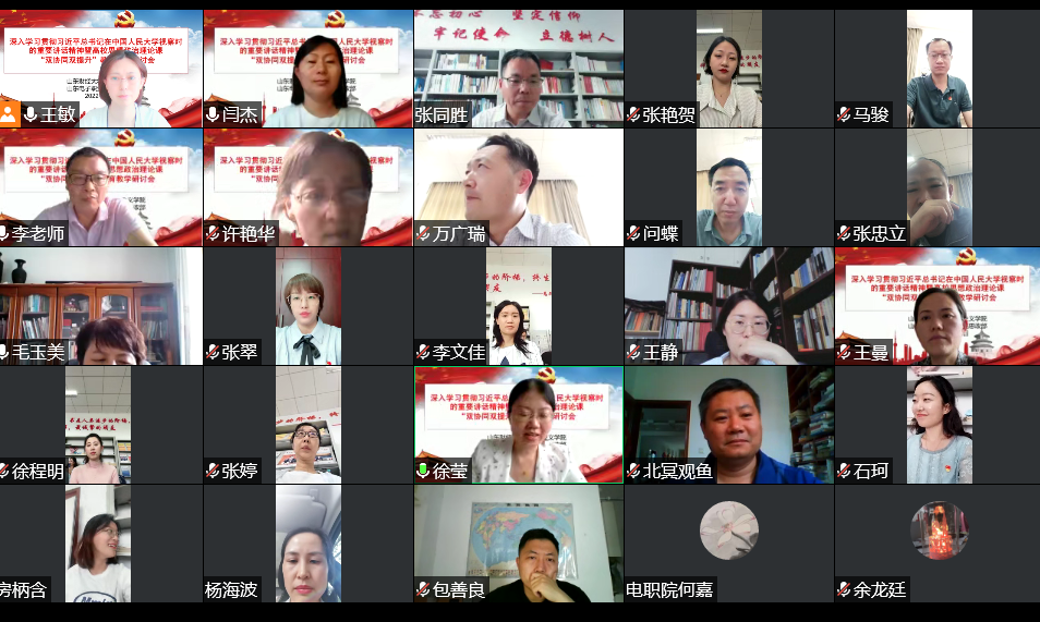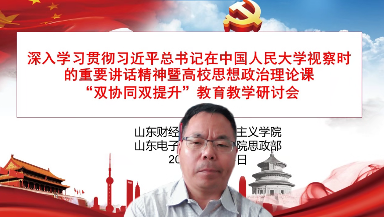 为深入贯彻习近平总书记关于教育的重要论述特别是学校思政课教师座谈会精神,贯彻落实《山东省大中小学思政课“双协同、双提升”项目工作方案》,6月14日下午,海角视频 与山东电子职业技术学院思政部联合召开深入学习贯彻习近平总书记在中国人民大学考察时的重要讲话精神暨高校思想政治理论课“双协同、双提升”教育教学研讨会。本次会议采用线上方式,围绕习近平总书记在中国人民大学考察时的重要讲话精神学习和高校思想政治理论课教育教学工作展开研讨。会议由徐莹院长主持,双方教师代表近40人参会。
