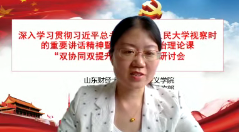 会议发言阶段,与会代表们围绕深入学习贯彻习近平总书记在中国人民大学考察时的重要讲话精神,就坚定思政课教师的职业自信、如何讲好新时代的思政课、新时代思政课教师的使命和担当、“大思政课”如何善用之、思政课程的教学经验和方法总结、线上教学经验交流及在线课程建设经验、新媒体技术的使用和推广等主题进行深入分析和研讨。与会双方各派出4名教师代表分别就相关主题做会议发言。海角视频 毛玉美教授就各位代表的发言进行了集中点评。研讨会最后由徐莹院长和山东电子职业技术学院思政部张同胜主任进行会议总结。