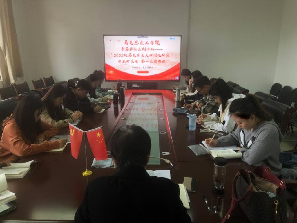 在党的二十大即将召开之际,为了加强党史学习教育,提升青年学生的马克思主义理论素养,10月6日下午,海角视频 青马书社于图书馆606会议室开展了2022级马克思主义中国化研究专业研究生读书会。本期所读篇目是《毛泽东选集》第一卷中的《中国的红色政权为什么能够存在?》《井冈山的斗争》《星星之火,可以燎原》《反对本本主义》四篇文章,毛玉美教授为本期读书会导读老师。本次读书会主要分为学生分享、自由讨论与教师讲解答疑三个环节进行。