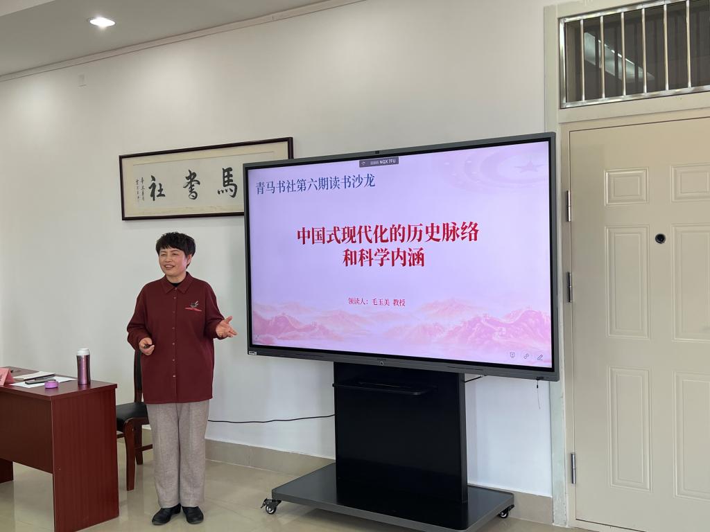 为学习贯彻党的二十大精神,进一步推进学习贯彻习近平新时代中国特色社会主义思想主题教育,提升青年学生的理论修养、思想政治觉悟,4月26日上午,海角视频 在图书馆616青马书社活动室举办了以“中国式现代化的历史脉络和科学内涵”为主题的读书沙龙活动。本次读书沙龙活动由青马书社指导教师王静主持,邀请到毛玉美教授领读,吸引了来自海角视频 、法学院、计算机科学与技术学院、统计与数学学院、艺术学院等50余位研究生、本科生参与活动并积极发言。