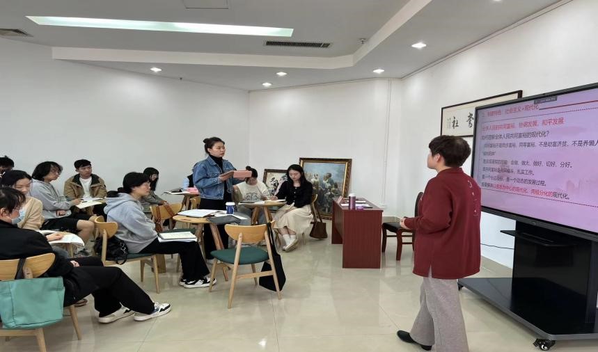 在领读环节,毛玉美教授主要从中国式现代化的历史脉络、科学内涵和意义价值三方面展开。通过精心选取的经典文献、案例和数据分析,毛教授从中国式现代化的制度特色、人口特色、文明特色等维度进行了细致剖析,指出党的领导直接关系中国式现代化的根本方向、前途命运、最终成败,中国式现代化打破了西方现代化的迷思,创造了人类文明的新形态,改写了世界现代化的版图。中国式现代化不是模板,不是再版,不是翻板,是原创板!毛教授通过与在场学生的充分互动,引导学生要毫不动摇坚持党的领导,坚持发扬斗争精神,为了实现人民对美好生活的向往、实现中华民族伟大复兴,青年学生要知重负重、苦干实干、攻坚克难。