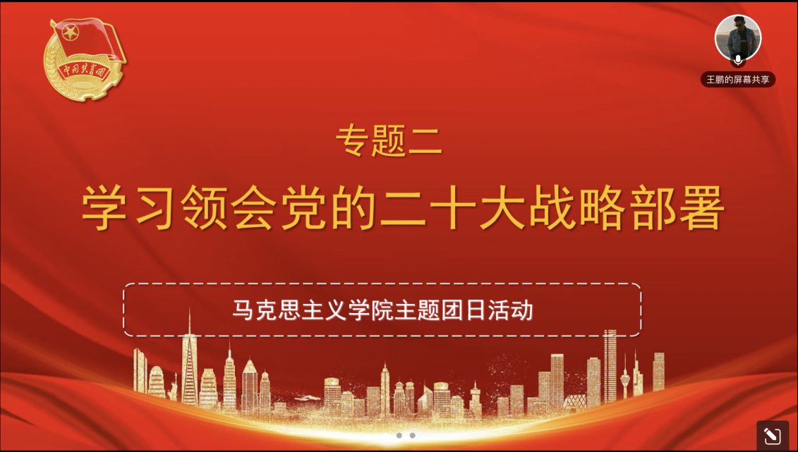 在“深入学习宣传贯彻党的二十大精神”的学习讨论中,2021级团支书王鹏同学以“学习领会党的二十大战略部署”为主题,对党的二十大报告中的战略部署、学思践悟“五个善于”、敢教日月换新天三方面内容展开阐述。通过认真研读,他认为,广大团员要积极响应团组织号召,学习宣传贯彻党的二十大精神,心系国家事、肩扛国家责,深刻认识自身责任与使命,始终在思想上政治上行动上同党中央保持高度一致。