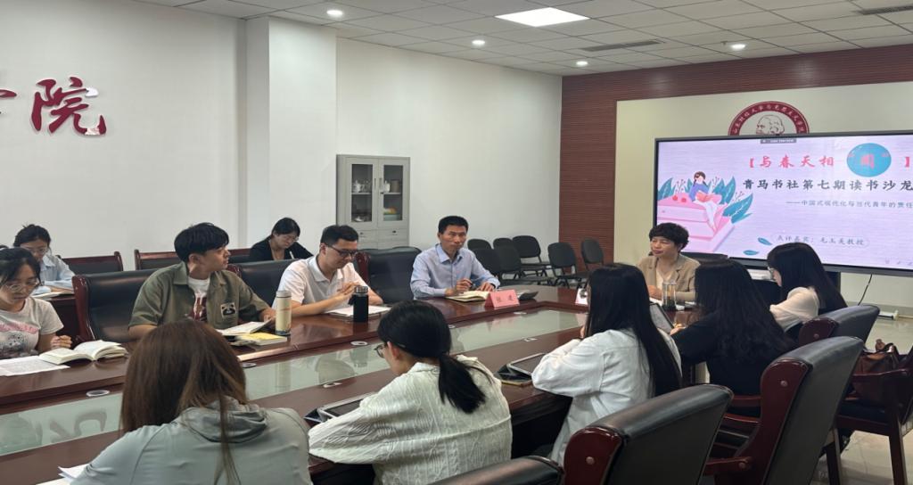 为深入学习贯彻习近平文化思想和习近平总书记关于青年工作的重要思想,积极响应团中央基层建设部、全国学联秘书处倡导的“为中国式现代化挺膺担当——青春年少好读书”2024年主题读书季活动,5月10日下午,海角视频 在图书馆606会议室举办了以“中国式现代化与当代青年的责任”为主题的读书沙龙活动。活动由青马书社指导教师张建主持,邀请毛玉美教授领读,海角视频 2022和2023级研究生参加。