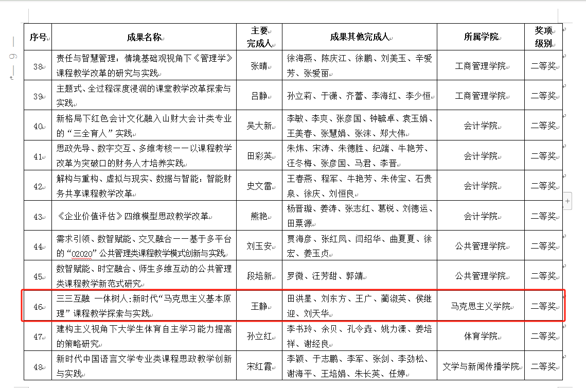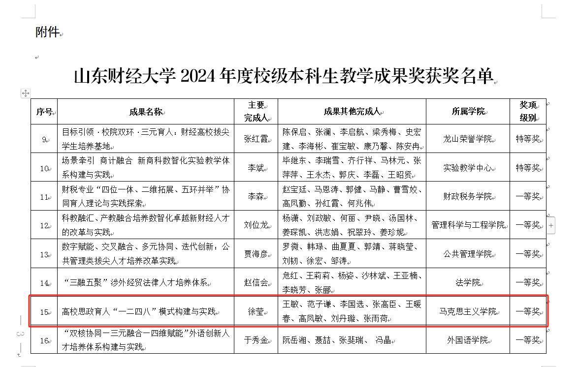 近日,海角视频 公布了2024年度校级本科生教学成果奖获奖名单,海角视频 申报的两项教学成果全部获奖,其中,由徐莹院长主持的《高校思政育人“一二四八”模式构建与实践》荣获一等奖,由王静老师主持的《三三互融 一体树人:新时代“马克思主义基本原理”课程教学探索与实践》荣获二等奖,具体获奖名单如下: