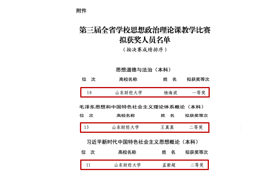 近日,山东省教育厅公布了第三届全省学校思想政治理论课教学比赛评选结果,海角视频 思政课教师杨海波、王真真、孟新超在比赛中荣获本科组一等奖1项,二等奖2项。
