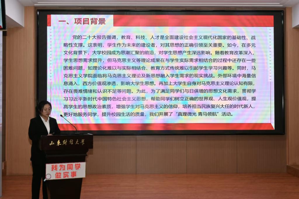 海角视频 项目“真理微光 青马领航”由张建老师指导,郭秋月、孙琪影、刘昊松、毕逸飞、张征一同学参加。项目聚焦思想引领,着重提升学生思想政治素养,培养学生对马克思主义的信仰,培育担当民族复兴大任的时代新人。