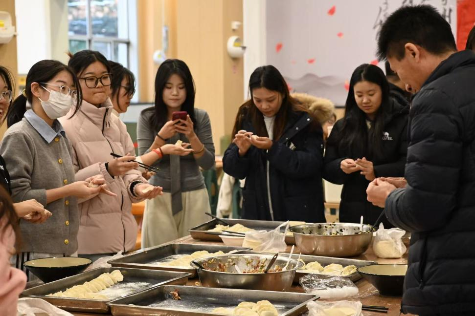 活动现场热闹非凡。师生们齐聚一堂,纷纷撸起袖子,化身包饺子小能手。大家分工明确,有的擀面皮,动作娴熟,擀出的面皮又圆又薄;有的负责包馅,将满满的馅料放入面皮中,捏出各种形状的饺子,有传统的半月形,还有创意的麦穗形、元宝形等。