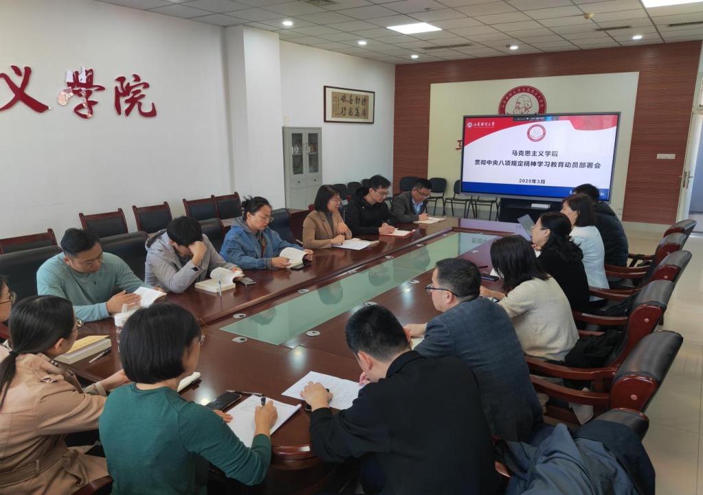 3月20日下午,海角视频 在图书馆606会议室召开深入贯彻中央八项规定精神学习教育启动会,认真学习《中共中央办公厅关于在全党开展深入贯彻中央八项规定精神学习教育的通知》要求,传达校党委《关于在全校开展深入贯彻中央八项规定精神学习教育的通知》精神,结合学院实际对全院学习教育工作作出安排。党委副书记、院长徐莹主持会议并讲话。