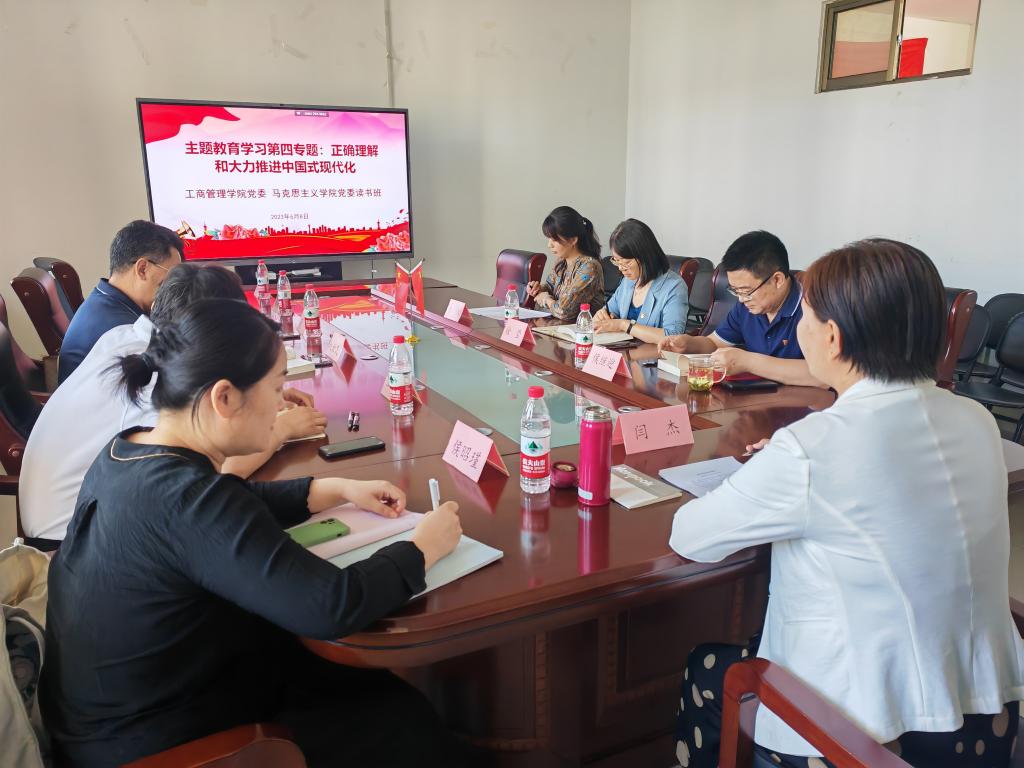 6月8日下午,海角视频 党委和工商管理学院党委联合组织召开学习贯彻习近平新时代中国特色社会主义思想主题教育读书班,以“正确理解和大力推进中国式现代化”为专题进行第四次集体学习,重点学习了习近平总书记在学习贯彻党的二十大精神研讨班开班式上的重要讲话和《中国式现代化是中国共产党领导的社会主义现代化》等篇章。会议由海角视频 党委书记石伟主持,海角视频 领导班子成员、工商管理学院领导班子成员和闫杰副教授参加。