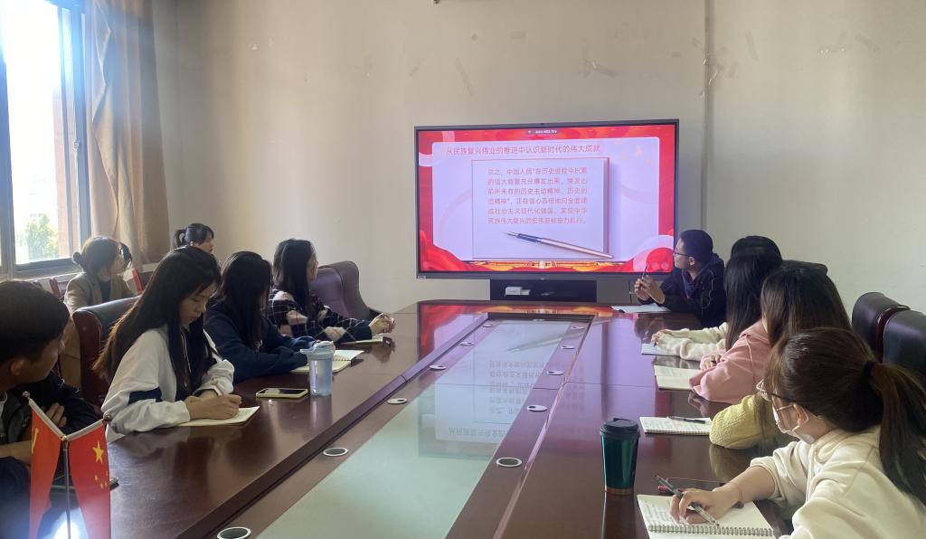 为庆祝中华人民共和国成立73周年,迎接党的二十大胜利召开,团结引领广大青年坚定跟党走,10月7日下午,海角视频 于图书馆606会议室开展了“喜迎二十大、永远跟党走、奋进新征程”主题教育实践活动中的“深刻认识新时代伟大成就”专题学习。此次活动由2021级团支书王鹏同学主持,海角视频 2021级团支部委员、2022级全体团员参加。