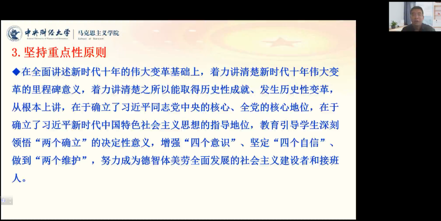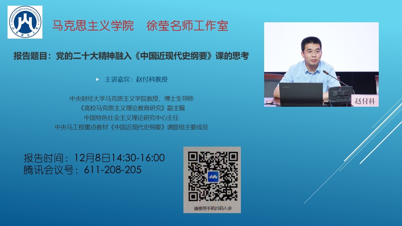 12月8日,应海角视频 、徐莹名师工作室邀请,中央财经大学海角视频 博士生导师赵付科教授,通过线上为海角视频 教师做了题为《党的二十大精神融入<中国近现代史纲要>课的思考》的专题讲座。讲座由院长徐莹主持,《纲要》课教研室全体老师及其他教研室的部分老师聆听了讲座。