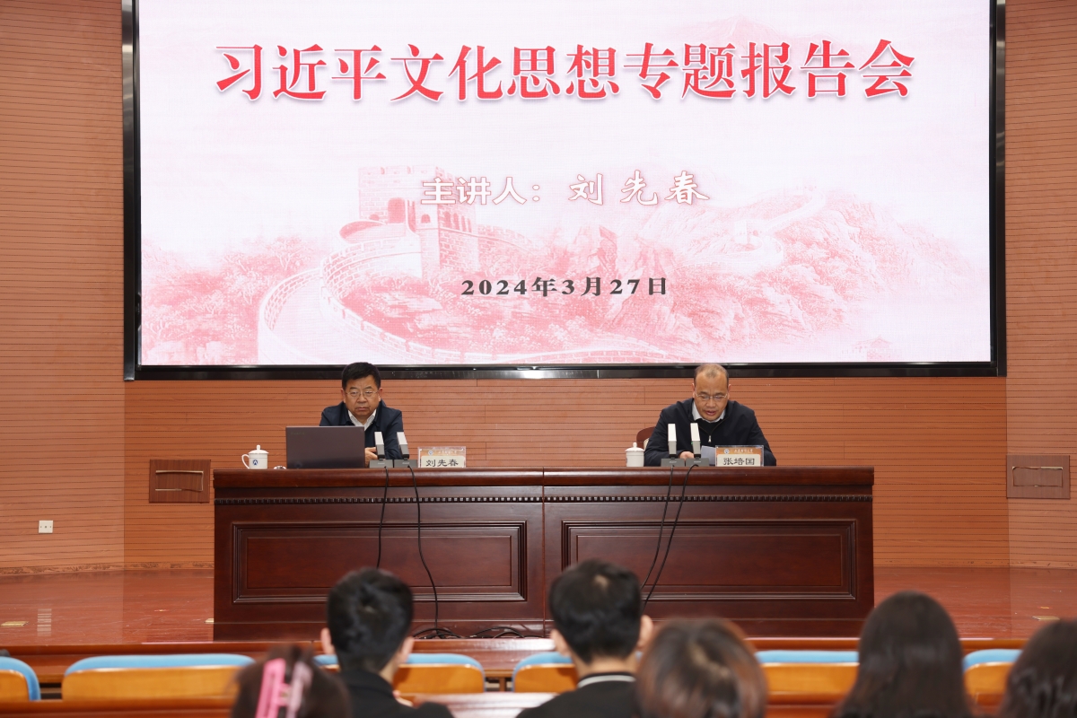 下午,刘先春为海角视频 师生作题为《深入学习贯彻习近平文化思想》的学术报告。校党委副书记张培国主持了报告会。