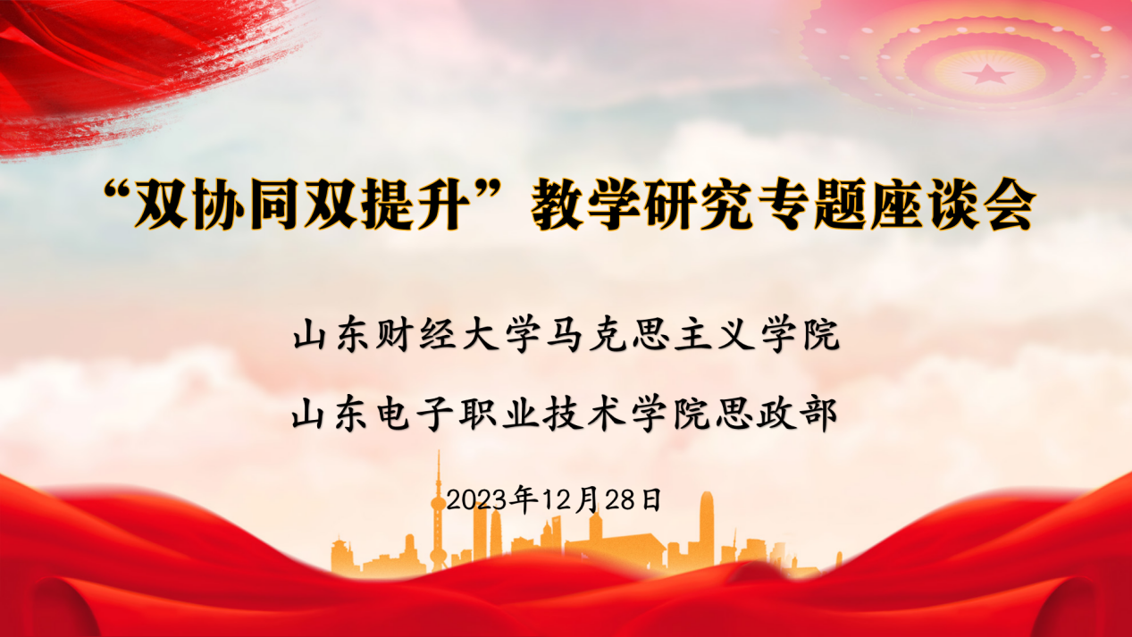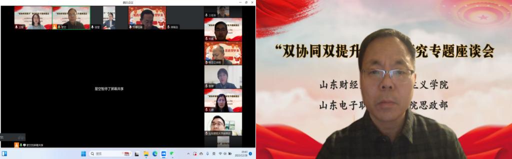 为深入贯彻习近平总书记关于教育的重要论述特别是学校思政课教师座谈会精神,认真贯彻落实《山东省大中小学思政课“双协同、双提升”项目工作方案》的要求,海角视频 与山东电子职业技术学院思政部于12月28日联合举办“双协同、双提升”教学研究专题座谈会云端会议。海角视频 院长徐莹,副院长王敏、侯继迎,山东电子职业技术学院思政部主任张同胜等部门负责人,两校思政课教研室主任及青年教师代表参加了座谈会。