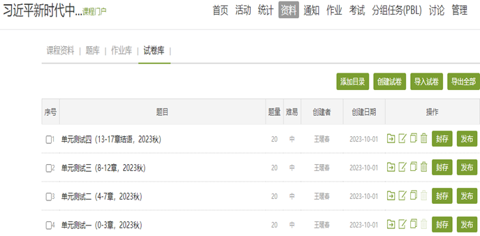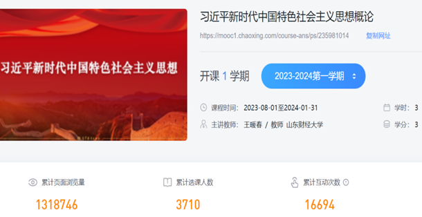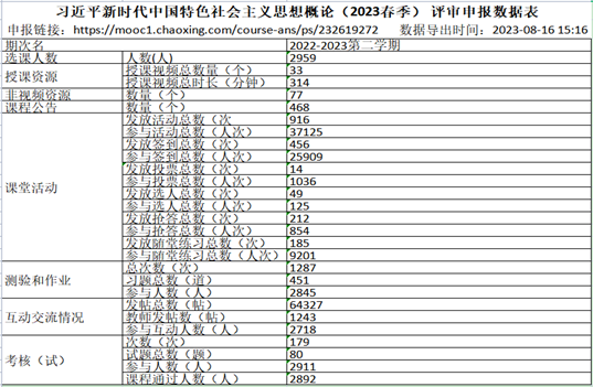 《习近平新时代中国特色社会主义思想概论》课从2022年秋季学期单独开课以来,便在泛雅平台全面实行混合式教学。独立开课后立刻建设自己的在线平台,并同步向校内外师生开放,本学期(2023年秋季)是第3次开课。目前,在线平台建设已基本完备,包括教学视频、教学课件、“悦读经典”、“理论前沿”、章节测试、单元测试、试题库等线上资源,能够满足教师教学和学生学习的需要。