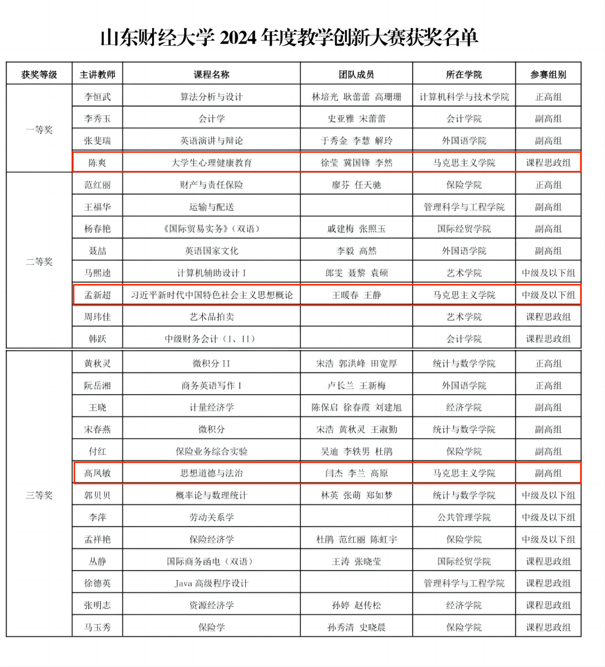 徐莹教授团队申报的《中国近现代史纲要》再获佳绩,根据比赛规则不重复授奖,作为校级基础课程正高组代表学校推荐参加省赛;陈爽老师团队申报的《大学生心理健康教育》获校级课程思政组一等奖,作为校级课程思政组代表学校参加省赛。孟新超老师团队申报的《习近平新时代中国特色社会主义思想概论》获校级中级及以下组二等奖,高凤敏老师团队申报的《思想道德与法治》获校级副高组三等奖。